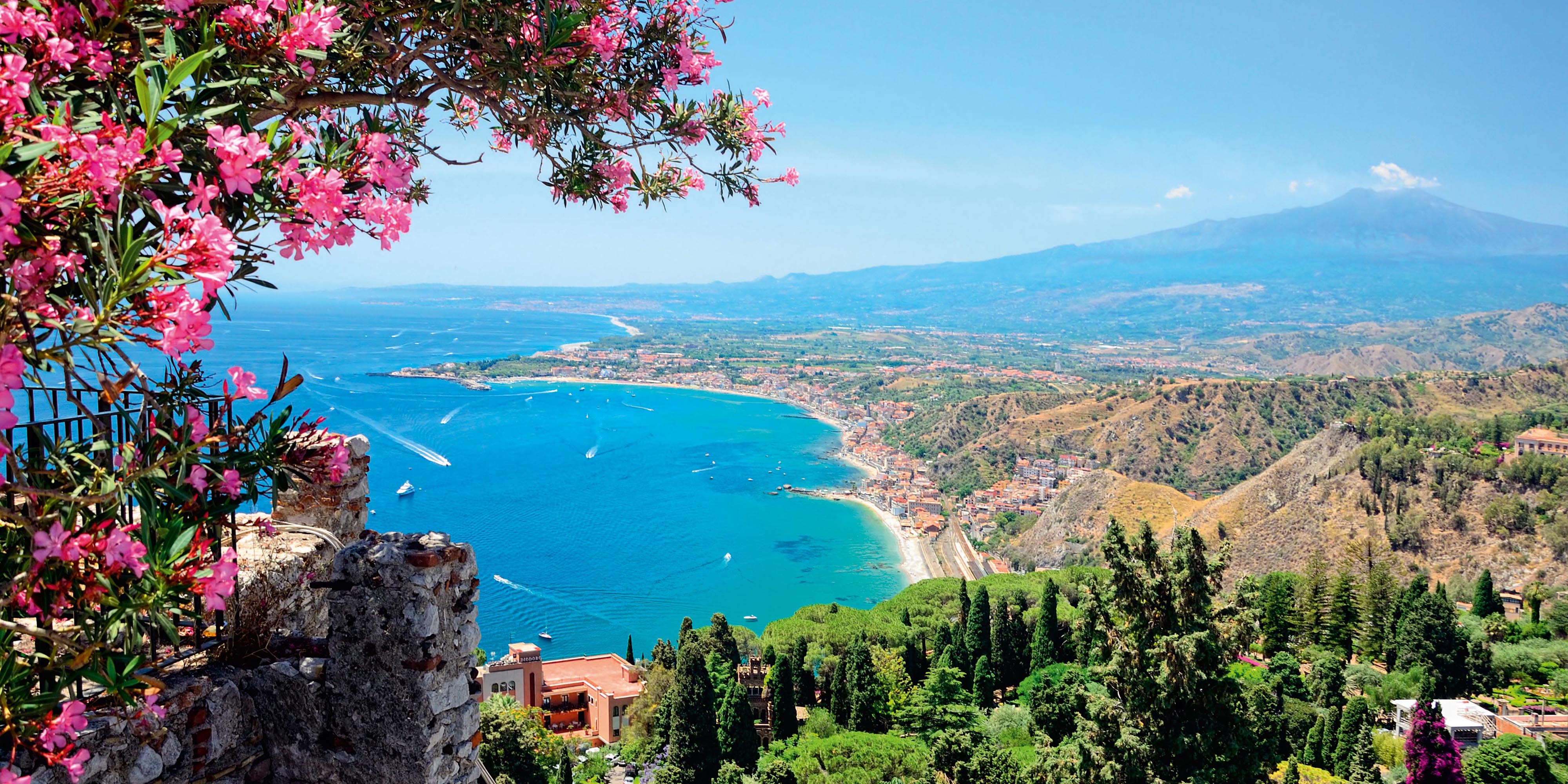 Der Ätna – Wahrzeichen Siziliens und Europas höchster aktiver Vulkan – prägt nicht nur die Landschaft, sondern sorgt mit seinen fruchtbaren Lavaströmen für üppige Zitronenhaine, Walnussbäume und Weingärten. Sizilien ist ein Schmelztiegel der Kulturen: Sprache, Küche und Architektur spiegeln die Einflüsse von Griechen, Römern, Arabern und Normannen wider.